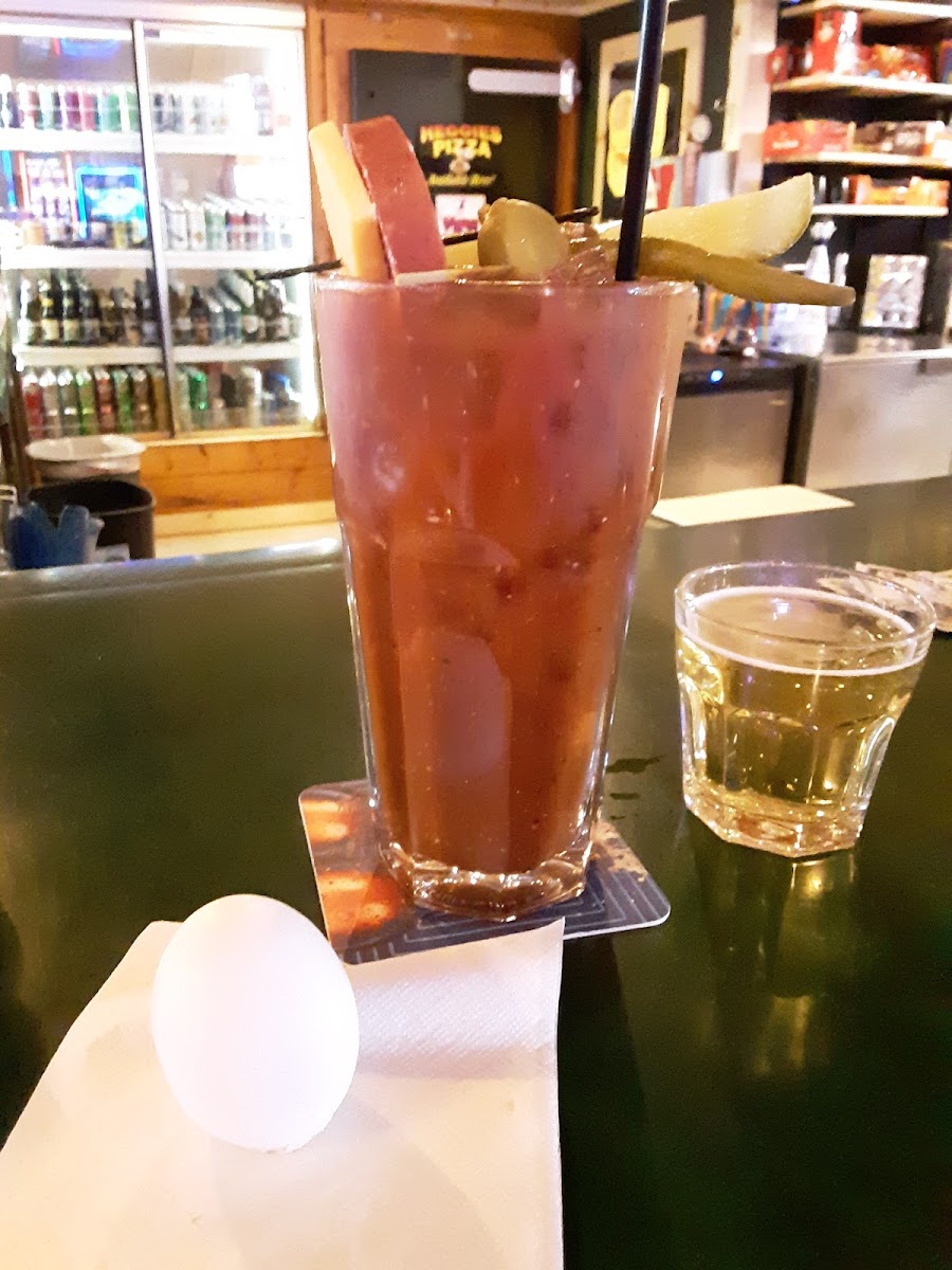 Excellent Bloody Mary's! Vodka is infused with jalapeno, horseradish and garlic. Yummy. Cheese and sausage slice, pickle, olives etc...and a hard boiled egg on the side. The bartender was great too. She was new, but did an excellent job.